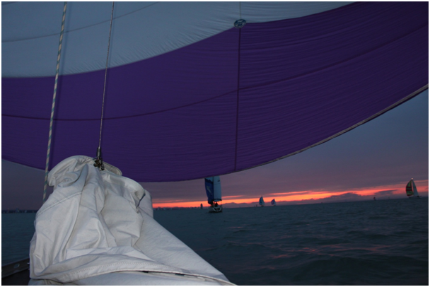 Bei ständig wechselnden Winden kamen wir zu anfangs nur schwer vom Fleck und büßten einigen Raum auf die führenden Schiffe ein. Auf dem Weg zur ersten Tonne in Romanshorn stabilisierte sich der Wind dann zum Glück mit 3 Bft aus Ost, so dass wir unter Spinnaker mit fast 6 Knoten in den Sonnenuntergang segeln konnten.